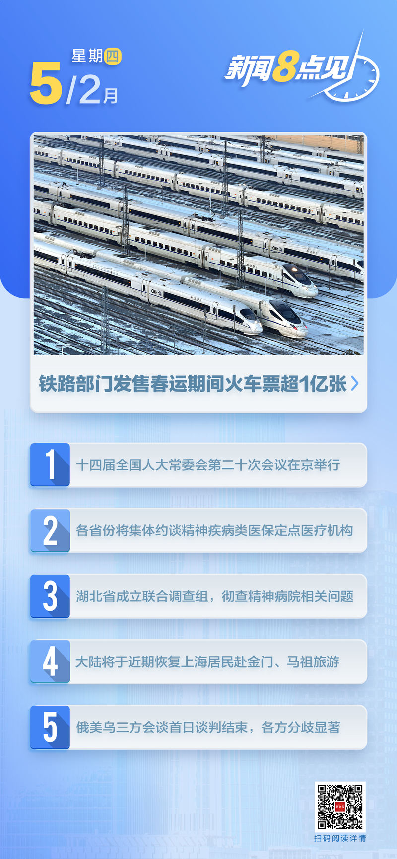 【时事新闻】第十四届全国人民代表大会常务委员会第二十次会议在北京举行。第十四届全国人民代表大会常务委员会第二十次会议4日在北京人民大会堂举行。 (新华社)阅读全文>>> 铁路部门春节期间销售火车票过亿。记者从中国国家铁路集团有限公司获悉,截至2月4日,全国铁路预计发送旅客1120万人次,计划增开旅客列车957列。铁路部门春节期间销售火车票超过1亿张。 2月3日,全国铁路发送旅客1094.6万人次,运输安全稳定有序。 (普韦布洛日报)阅读全文>>>>文化和旅游部、国家消防救援总局印发通知,促进健康有序开发新的娱乐场所。文化和旅游部、国家消防救援办公室近日发布《关于促进新建演出场所健康有序发展的通知》。为进一步明确新建娱乐场所消防安全标准,优化演出审批流程,促进新建娱乐场所健康有序发展,《通知》明确提出了优化审批申请服务、营造良好营商环境、强化市场开拓、推动创新融合发展、落实安保主体责任、自觉维护娱乐市场秩序三级要求。 (央视新闻) 阅读全文 >>> 中国大陆恢复 近期上海居民前往金门岛、马祖岛的旅游将会增加。为进一步推动两岸人员往来正常化,迎接各界热切期待为了配合台湾民众和旅游业的发展,促进两岸同胞的利益和福祉,大陆将于近期恢复上海居民赴金马群岛旅游。目前各项任务正在准备中。希望海峡两岸旅游业加强沟通和口岸建设,为大陆居民前往金门、马祖岛旅游提供优质的服务和产品。 (文化和旅游部政府门户网站)内地计划近期恢复上海居民前往金门岛、马祖岛的旅游。国台办:我们积极支持该项目,并对项目的成功感到满意。国台办发言人陈斌华4日回答记者提问时表示,中国大陆始终秉持“台独”理念。“海峡两岸一家人”,为了台湾同胞的利益,我们致力于两岸人员交往正常化,采取一切可能的措施。他表示,一直支持乡村交流正常化。文化和旅游部宣布,上海居民近期将恢复金门、马祖旅游。这是符合加强两岸同胞交流热情的务实举措。这是在回应社会主流舆论台湾民众要和平、要发展、要交流、要合作,我们积极支持,对结果感到满意2月4日,记者在会上获悉,今年北京将扩大景区门票代购平台准入范围,覆盖3A级景区和部分博物馆。 (新京报)阅读全文>>>北京楼市迎来“暖冬”,1月份网上签约二手房超过1.5万套。 2026年1月,北京半新房网上签约量达5082套,同比增长超过20%,为2022年以来同期最高。与上月相比,销售受季节因素影响下降12.3%。总体来看,市场预期回暖和短期政策效应共同刺激存量房市,打造“暖冬市场”。 (北京报)阅读全文>>> 【社会】国家医保局:开始对精神疾病保险定点医疗机构进行集体访谈。于日4日,国家医保局印发通知,进一步加强精神疾病医疗保险定点医疗机构(含综合医院精神科,以下简称“精神科”)。精神疾病等定点医疗机构管理人员要严格控制和挪用医保基金。本周前,各国家医保部门要组织对辖区内所有定点精神卫生机构负责人进行集体约谈,告知相关医保法律和监管政策。同时,将近期媒体曝光的情况以及以往对湖北省襄阳市、宜昌市部分定点精神科医疗机构突击检查中发现的问题作为反面案例,开展预防教育,强化医保基金合法合规意识。n 定点精神科医疗机构。 (央视新闻)阅读全文>>>湖北省成立联合调查组赴襄阳宜昌市彻查神州医院相关问题。湖北省成立联合调查组赴襄阳、宜昌对媒体报道的部分精神病医院涉嫌违规收治患者、骗取医保待遇问题进行详细调查。联合调查组由省纪委、省卫健委、省公安厅、省医保办等部门组成。对媒体和公众举报的事项,经核实后,将依纪依法严肃处理,并追究相关责任人的责任。 (湖北省公布)阅读全文xt>>> 【财经】欧盟委员会依据国外补贴规定对中国风电企业发起全面调查。商务部回应:欧盟委员会近日宣布,根据《外国补贴条例》(FSR)对中国风电企业发起全面调查。美国商务部发言人表示,欧方近期开始对中国企业进行调查,频繁使用外国补贴规则的调查工具,还将对风能和安全设备企业的调查提升为全面调查。这显然是选择性和歧视性的。中方对此深表关切并强烈不满。 (商务部)阅读全文>>>【体育/文化】广播电视台“2026年春节联欢晚会”主持人名单已公布中央广播电视总台主持人名单n的“2026年春节联欢晚会”已于2月4日官宣,任鲁豫、撒贝宁、尼格买提、龙阳、马凡书、刘欣跃将在北京共同主持2026年春节联欢晚会主会场。四个分会的组织者是黑龙江哈尔滨分会的杨帆先生和姜铎先生。浙江省义乌市分公司郭若田先生、何川先生。安徽合肥分公司的朱迅和白宇。四川省宜宾市分行的张涛先生、王忠汉先生。 (央视新闻)宁忠岩、张楚桐将担任米兰冬奥会开幕式中国体育代表团旗手。米兰冬奥会中国体育代表团宣布,他将在6日的冬奥会开幕式上担任中国代表团旗手。参赛者为男子速滑运动员宁中彦和短道速滑运动员张楚桐。 (新华社)国庆节第一天亚洲乒乓球杯上,“沙托”伤愈复出,平安无事。第35届国际乒联/亚洲乒联亚洲杯小组赛首日比赛于第4天在海口落下帷幕。孙颖莎和王楚钦伤愈后重返国际舞台,取得“开门红”。日本国乒的其他队员也获得了他们的第一个冠军。 (新华社)【国际】俄罗斯、美国、乌克兰三方会谈首日以各方意见分歧较大结束。当地时间4日,俄罗斯、美国和乌