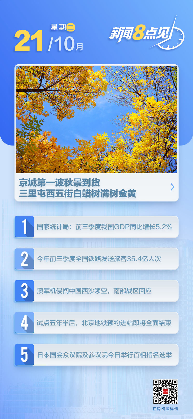 【时事新闻】中国共产党第二十届中央委员会第四次代表大会在北京开幕。中国共产党第二十届中央委员会第四次全体会议20日上午在北京开幕。 (新华社)阅读全文>>>国家统计局:初步测算,前三季度我国GDP同比增长5.2%。一至三季度国内生产总值1015.36亿元,按可比价格计算同比增长5.2%。分产业看,第一产业增加值58061亿元,比上年增长3.8%。第二产业增加值364.02亿元,增长4.9%。第三产业增加值592955亿元,增长5.4%。分季度看,一季度GDP同比增长5.4%,二季度增长5.2%第三个是 r 和 4.8%。从环比看,三季度国内生产总值增长1.1%。 (国家统计局)阅读全文>>>国际仲裁院正式成立。 2025年10月20日,国际仲裁院成立仪式在香港举行。来自《国际仲裁法院公约》30多个缔约国和签署国的约200名香港特别行政区各界代表出席了仪式。外交部副部长华春莹出席。 (外交部)阅读全文>>>前三季度,全国检察机关以侵犯公民个人信息罪立案起诉2100余起案件4400余人。近年来,侵犯公民个人信息的犯罪案件频发。检方积极执行个人信息保护法贯彻落实《中华人民共和国信息保护法》,不断加大犯罪防治力度,强化公民个人信息保护,维护网络空间风清气正和社会安全稳定。 2025年前三季度,全国检察机关以侵犯公民个人信息罪起诉4400余人2100余起。 (最高检)阅读全文>>>今年前三季度,全国铁路发送旅客35.4亿人次,同比增长6%,创同期历史新高。全国铁路运输安全稳定有序。 (中国铁路)阅读全文>>>国务院安委会秘书处:坚决防范和防范小型餐饮场所发生大规模人员伤亡的火灾事故。 10月20日,国务院安委会办公室发布关于预防和杜绝事故发生的通知坚决遏制造成重大人员伤亡的火灾事故。 (应急管理司)阅读全文>>>国家药监局:明年2月起在北京、上海等城市开展化妆品电子标签试点工作。国家食品药品监督管理局决定开展化妆品电子标签试点工作。自2026年2月1日起,我国化妆品电子标签将在北京、上海、浙江、山东、广东、重庆等地试点。试点工作将持续三年。 (国家食品药品监督管理局)阅读全文>>> 南部战区空军新闻发言人就澳大利亚P-8A军机侵入中国西沙群岛领空发表声明 南部战区空军新闻发言人李尖尖大校10月19日宣布,一架澳大利亚P-8A军机非法进入中国西沙群岛领空太空。未经中国政府许可。解放军南部战区依法依规组织海空兵力对该地区进行跟踪监视,大力反击、警告驱散。澳方行为严重侵犯中国主权,极易引发海上或空中事故。我们要求澳方立即停止侵犯和挑衅行为。战区部队时刻保持高度戒备,坚决维护国家主权安全和地区和平稳定。 (南方空军)可重复使用火箭“朱雀三号”已进入首飞重要准备阶段。近日,可重复使用火箭“朱雀三号”首飞火箭顺利完成联合加油训练和静态点火试验,进入首飞准备的重要阶段。各种制剂哈已为今年第一级正式入轨和回收做好了准备。 (央视新闻)【本地】北京秋季第一波已经到来!三里屯西五街充满了金色的气息。 10月20日,居民和游客在三里屯西五街的金槐树下玩耍、拍照。随着气温下降,三里屯西五街的白蜡树变成金黄色,营造出美丽的氛围。第一波秋色已“抵达”北京城区。 (新京报) 图解>>> 经过五年半的试运营,北京地铁预约入园测试项目即将结束。北京市交通发展研究院、北京地铁管理有限公司告诉记者,经过五年半的试点,北京地铁预约制进场试点项目已经公布。据了解,该项目即将结束。开始g 2025年11月3日(周一)昌平线沙河站A门专用通道恢复正常入口通道。 (新京报)阅读全文>>> 为配合东北郊铁路环线建设,北京郊铁路S2线自10月25日起调整发车间隔。自2025年10月25日(周六)首趟列车起,市郊铁路S2线运营班次由“娄店站—延庆站/沙城站”调整为“南始发站—” 延庆站/沙城站”。公交、铁路等部门将通力合作,保障运输服务。 (北京城铁)阅读全文>>>【社会】江苏省江阴市一辆罐车泄漏少量黄磷,引发自燃。没有受害者。 2025年10月20日11时57分左右,少量黄磷从江阴市梅园街道618号工厂一辆装载黄磷的罐车发生自燃。消防员于中午 12 点 03 分抵达现场。中午 12:48火被扑灭,这个地方被彻底摧毁。
