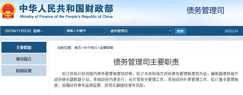 财政部网站“机构设置”栏目最新信息显示,财政部债务管理办公室已成立。财政部债务管理办公室的主要职责是制定和实施政府内部债务管理制度和政策。制定中央和地方政府债务管理制度和方法。制定国家和地方债务余额限额计划。负责内部政府债券的发行、兑付等相关管理工作。负责管理政府外债并制定基本管理制度。加强公共债务监测监管,防范化解债务隐性风险。信贷管理部下设综合处、中央债务处、地方债券一处、地方债券二处、发行兑付处、监测处等六个处室。d 管理部门。李大伟担任债务管理经理,曲富国、赵泽勇担任副经理。据报道,财政部将于今年 9 月设立一个新部门来管理公共债务。